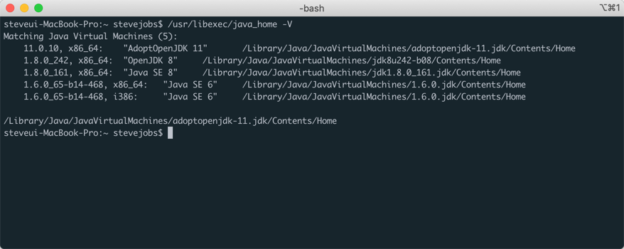 | steveui-MacBook-Pro:~ stevejobs$ /usr/libexec/java_home -V Matching Java Virtual Machines (5): 11.0.10, x86_64: "AdoptOpenJDK 11" /Library/Java/JavaVirtualMachines/adoptopenjdk-11.jdk/Contents/Home 1.8.0_242, x86_64: "OpenJDK 8" /Library/Java/JavaVirtualMachines/jdk8u242-b08/Contents/Home 1.8.0_161, x86_64: "Java SE 8" /Library/Java/JavaVirtualMachines/jdk1.8.0_161.jdk/Contents/Home 1.6.0_65-b14-468, i386: "Java SE 6" /Library/Java/JavaVirtualMachines/1.6.0.jdk/Contents/Home 1.6.0_65-b14-468, x86_64: "Java SE 6" /Library/Java/JavaVirtualMachines/1.6.0.jdk/Contents/Home /Library/Java/JavaVirtualMachines/adoptopenjdk-11.jdk/Contents/Home steveui-MacBook-Pro:~ stevejobs$ |