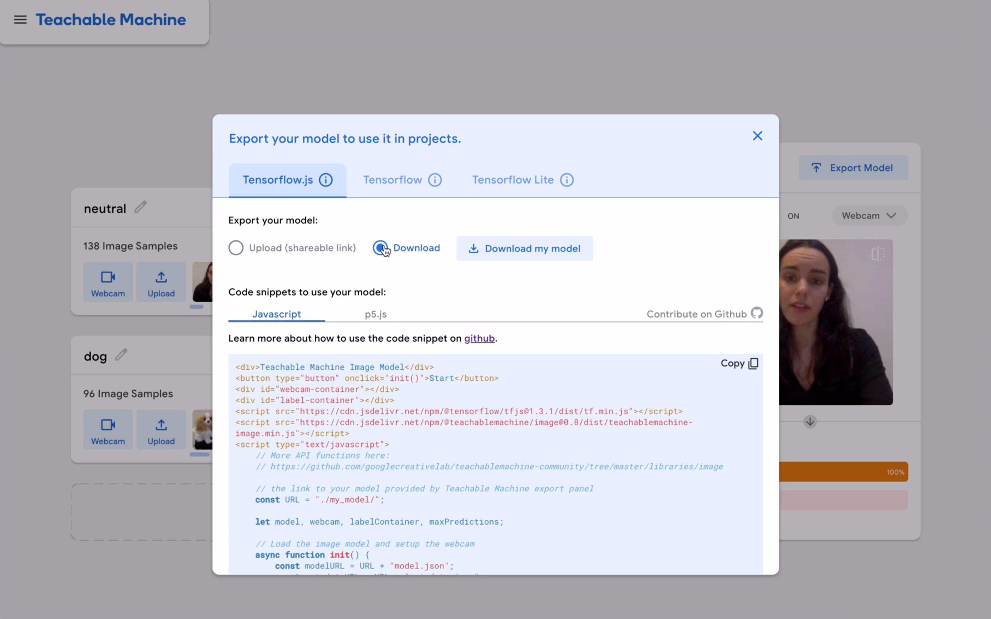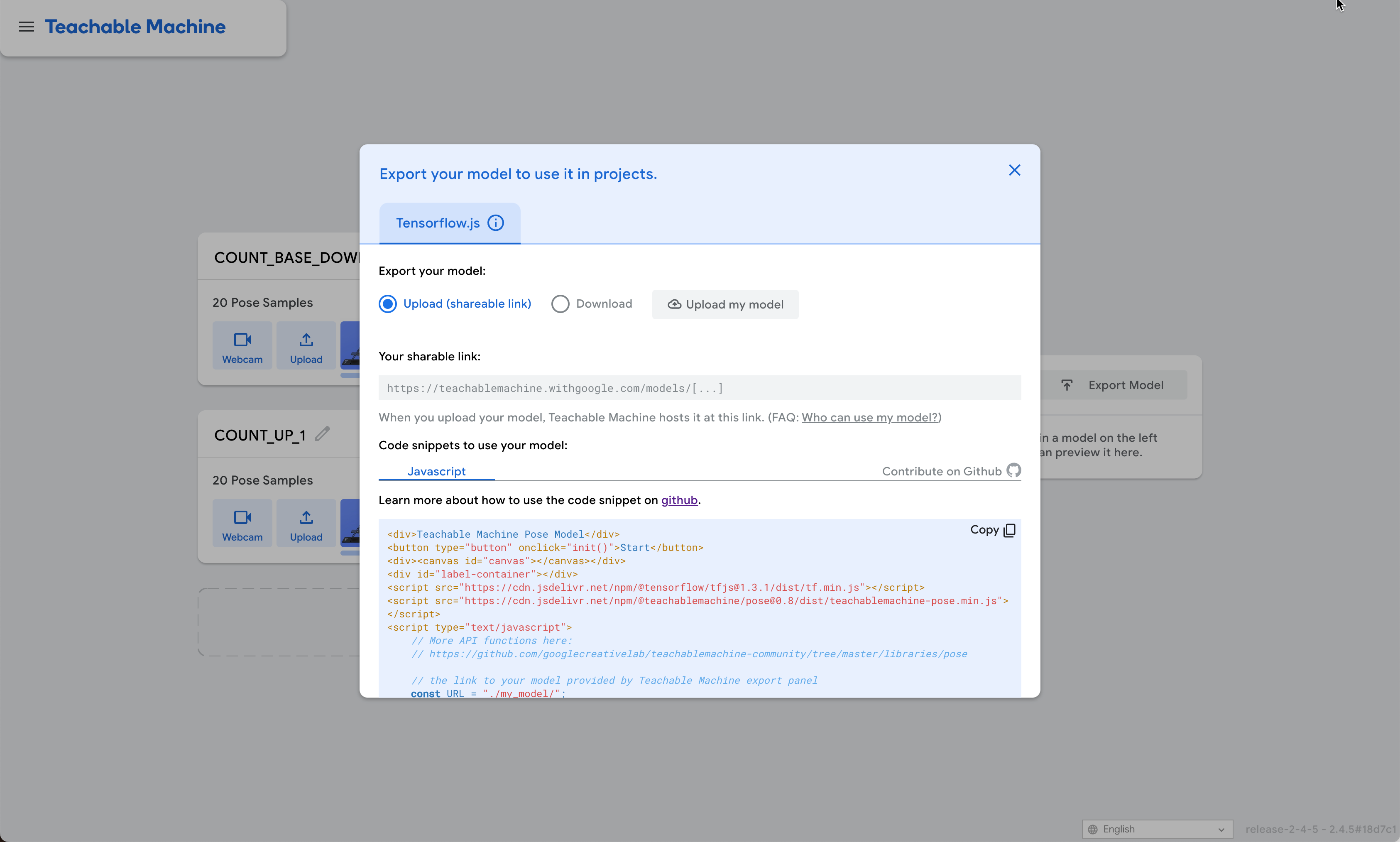 Google Teachable Machine 사이트에서 Training 및 Model Export 기능을 사용하여