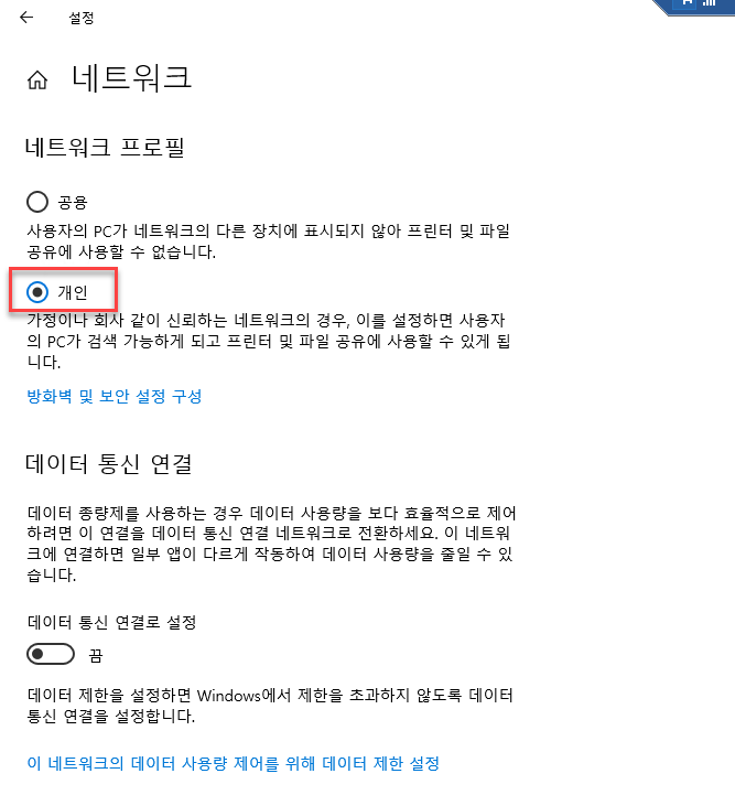 네트워크 프로필 항목에서 "개인"으로 선택하여 설정을 변경한다.