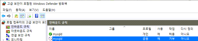 "mysqld"가 프로필 : 공용 , 작업 : 거부 되어 있다.