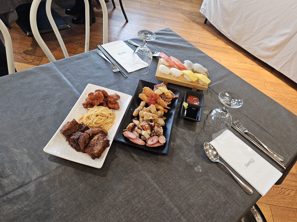 엄마 아빠는 따로 상차림을 해줍니다. 사진에선 빠졌는데 스테이크도 챙겨주시네요^^ 조금 부족한건 가족들이 이것저것 챙겨서 가져다 주면 돼요.