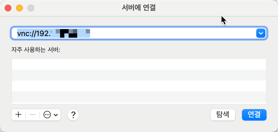 Finder > 이동 > 서버에 연결 선택하면 별도 프로그램 없이 VNC 원격 접속이 가능하다.