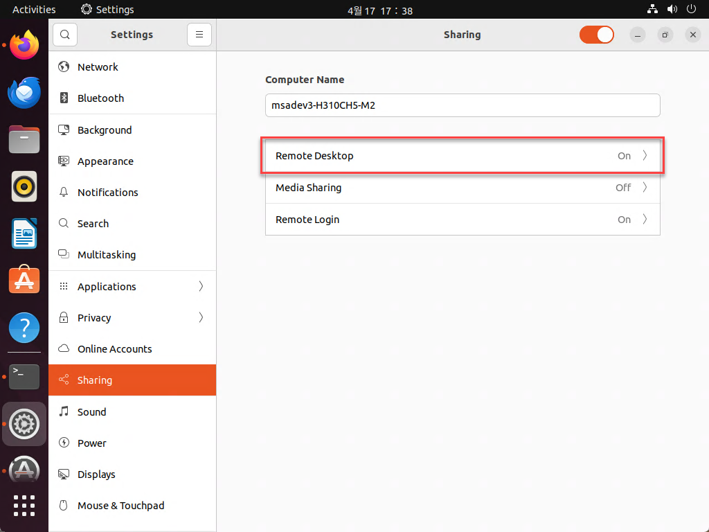 Remote Control 활성화 => 원격 마우스 및 키보드로 화면 제어 위해 필요