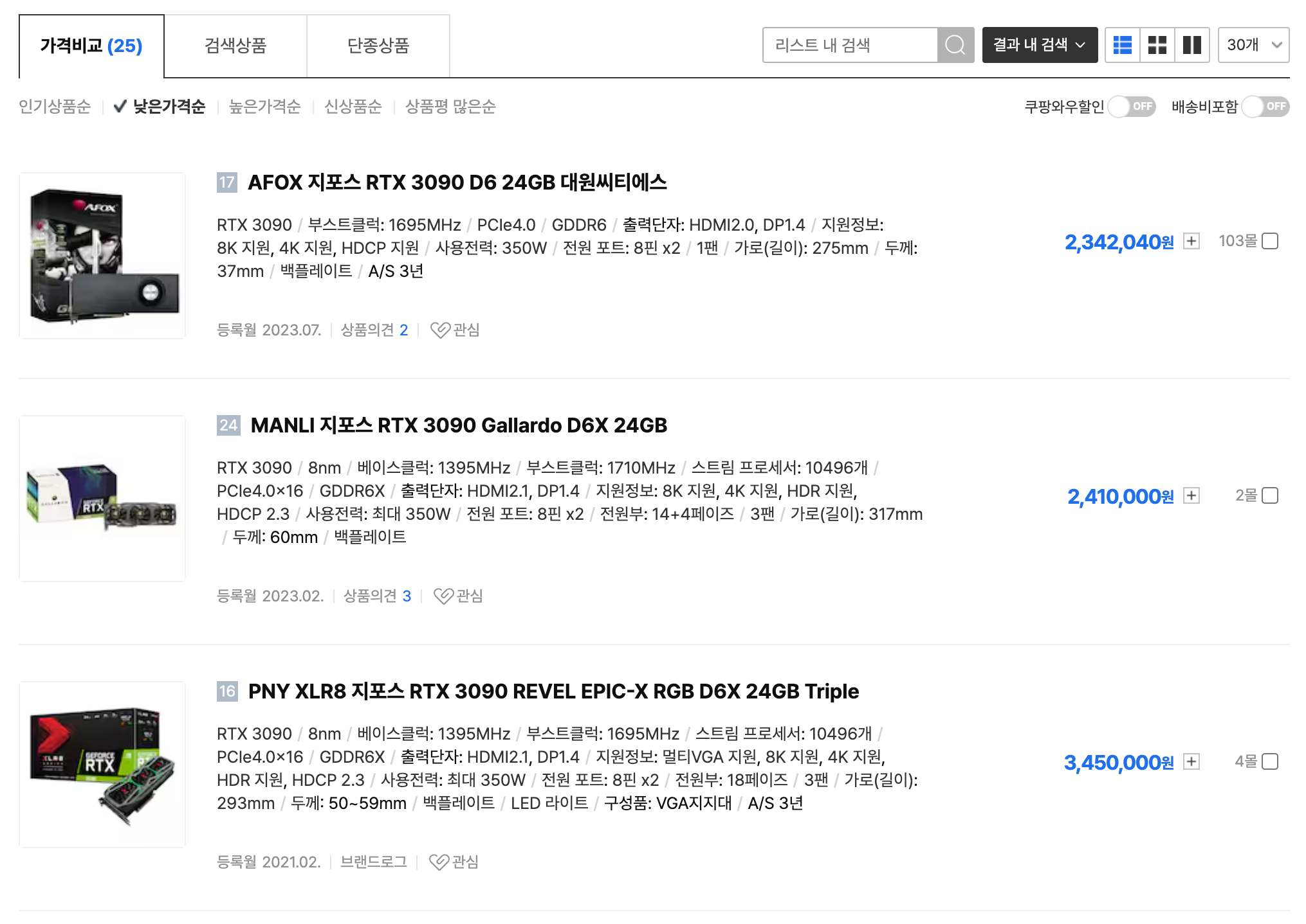 그러면 다나와에서 그래픽카드만 230만원 이상의 투자가 필요할듯 하다.