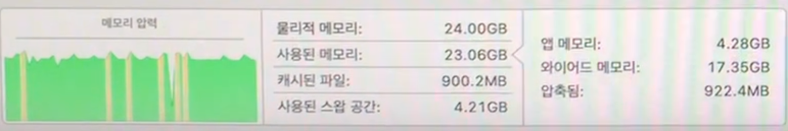다만, 메모리 압력이 상당히 높은것을 확인할수 있다. 이때 다른 멀티태스킹 프로그램들을 종료하는등의 정리는 하지 않고 그냥 무작정 구동을 시켰다.