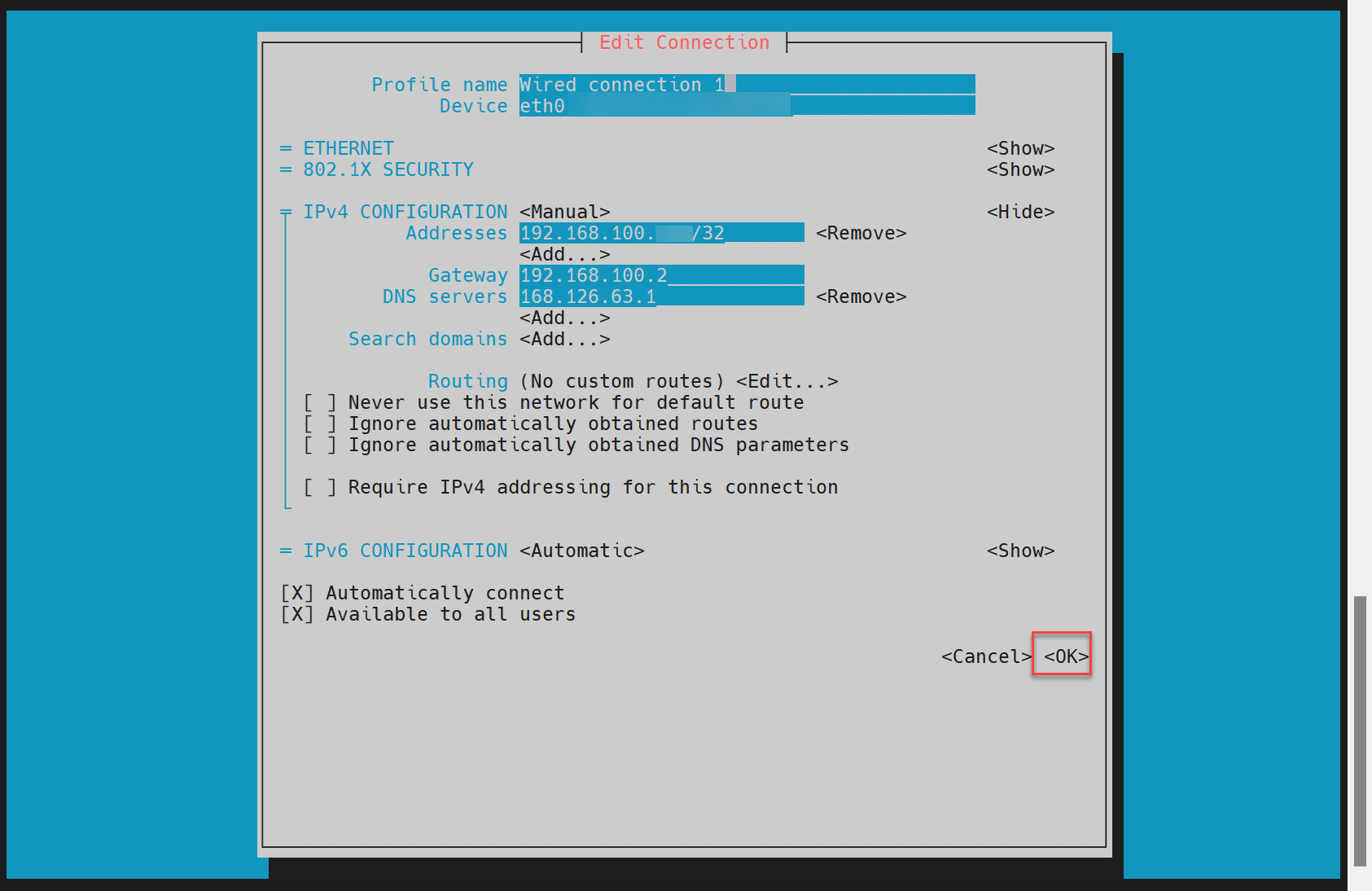 * 원하는 고정 IP 정보 입력후 <OK> 선택하여 나온다.