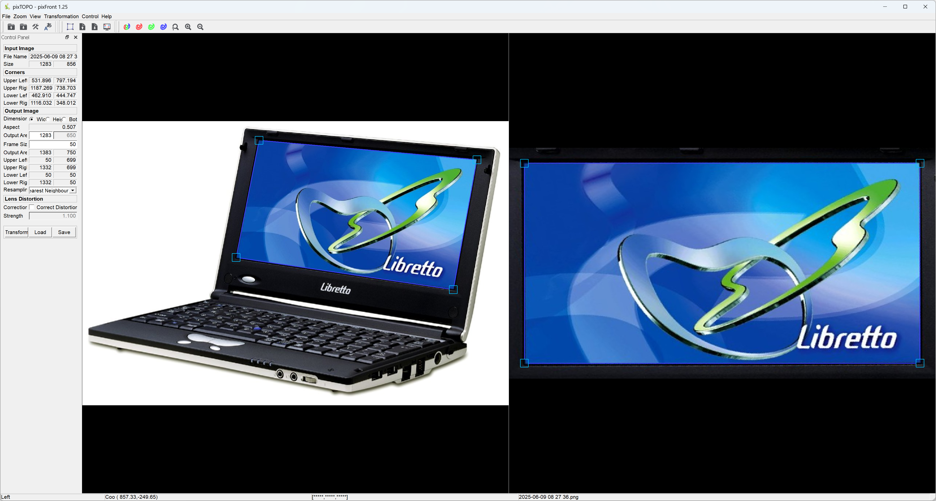 사용법은 간단하다. 대상 이미지에서 변환할 네개의 모서리를 끌어다 지정한후 (아쉽게도 자동이 아니다) Trasformation > transfor Image 메뉴를 선택하면 우측 결과 이미지 처럼 반듯하게 변환하여 준다.