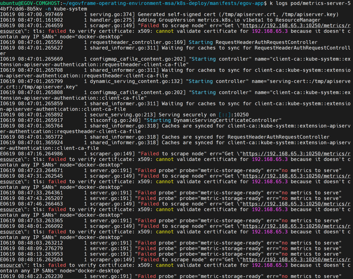 kubectl logs pod/metrics-server-54bf7cdd6-8b5kv -n kube-system I0619 08:47:00.997469 1 serving.go:374] Generated self-signed cert (/tmp/apiserver.crt, /tmp/apiserver.key) I0619 08:47:01.161902 1 handler.go:275] Adding GroupVersion metrics.k8s.io v1beta1 to ResourceManager E0619 08:47:01.264659 1 scraper.go:149] "Failed to scrape node" err="Get \"https://192.168.65.3:10250/metrics/resource\": tls: failed to verify certificate: x509: cannot validate certificate for 192.168.65.3 because it doesn't contain any IP SANs" node="docker-desktop" I0619 08:47:01.265592 1 requestheader_controller.go:169] Starting RequestHeaderAuthRequestController I0619 08:47:01.265627 1 shared_informer.go:311] Waiting for caches to sync for RequestHeaderAuthRequestController I0619 08:47:01.265669 1 configmap_cafile_content.go:202] "Starting controller" name="client-ca::kube-system::extension-apiserver-authentication::requestheader-client-ca-file" I0619 08:47:01.265708 1 shared_informer.go:311] Waiting for caches to sync for client-ca::kube-system::extension-apiserver-authentication::requestheader-client-ca-file I0619 08:47:01.265799 1 dynamic_serving_content.go:132] "Starting controller" name="serving-cert::/tmp/apiserver.crt::/tmp/apiserver.key" I0619 08:47:01.265808 1 configmap_cafile_content.go:202] "Starting controller" name="client-ca::kube-system::extension-apiserver-authentication::client-ca-file" I0619 08:47:01.265859 1 shared_informer.go:311] Waiting for caches to sync for client-ca::kube-system::extension-apiserver-authentication::client-ca-file I0619 08:47:01.265892 1 secure_serving.go:213] Serving securely on [::]:10250 I0619 08:47:01.265917 1 tlsconfig.go:240] "Starting DynamicServingCertificateController" I0619 08:47:01.365764 1 shared_informer.go:318] Caches are synced for client-ca::kube-system::extension-apiserver-authentication::requestheader-client-ca-file I0619 08:47:01.365772 1 shared_informer.go:318] Caches are synced for RequestHeaderAuthRequestController I0619 08:47:01.365924 1 shared_informer.go:318] Caches are synced for client-ca::kube-system::extension-apiserver-authentication::client-ca-file E0619 08:47:16.264986 1 scraper.go:149] "Failed to scrape node" err="Get \"https://192.168.65.3:10250/metrics/resource\": tls: failed to verify certificate: x509: cannot validate certificate for 192.168.65.3 because it doesn't contain any IP SANs" node="docker-desktop" I0619 08:47:23.264671 1 server.go:191] "Failed probe" probe="metric-storage-ready" err="no metrics to serve" E0619 08:47:31.262545 1 scraper.go:149] "Failed to scrape node" err="Get \"https://192.168.65.3:10250/metrics/resource\": tls: failed to verify certificate: x509: cannot validate certificate for 192.168.65.3 because it doesn't contain any IP SANs" node="docker-desktop" I0619 08:47:33.264361 1 server.go:191] "Failed probe" probe="metric-storage-ready" err="no metrics to serve" I0619 08:47:43.265207 1 server.go:191] "Failed probe" probe="metric-storage-ready" err="no metrics to serve" E0619 08:47:46.266463 1 scraper.go:149] "Failed to scrape node" err="Get \"https://192.168.65.3:10250/metrics/resource\": tls: failed to verify certificate: x509: cannot validate certificate for 192.168.65.3 because it doesn't contain any IP SANs" node="docker-desktop" I0619 08:47:53.263365 1 server.go:191] "Failed probe" probe="metric-storage-ready" err="no metrics to serve" E0619 08:48:01.266092 1 scraper.go:149] "Failed to scrape node" err="Get \"https://192.168.65.3:10250/metrics/resource\": tls: failed to verify certificate: x509: cannot validate certificate for 192.168.65.3 because it doesn't contain any IP SANs" node="docker-desktop" I0619 08:48:03.263212 1 server.go:191] "Failed probe" probe="metric-storage-ready" err="no metrics to serve" I0619 08:48:09.276279 1 server.go:191] "Failed probe" probe="metric-storage-ready" err="no metrics to serve" I0619 08:48:13.263953 1 server.go:191] "Failed probe" probe="metric-storage-ready" err="no metrics to serve" E0619 08:48:16.262504 1 scraper.go:149] "Failed to scrape node" err="Get \"https://192.168.65.3:10250/metrics/resource\": tls: failed to verify certificate: x509: cannot validate certificate for 192.168.65.3 because it doesn't contain any IP SANs" node="docker-desktop" I0619 08:48:23.262230 1 server.go:191] "Failed probe" probe="metric-storage-ready" err="no metrics to serve"